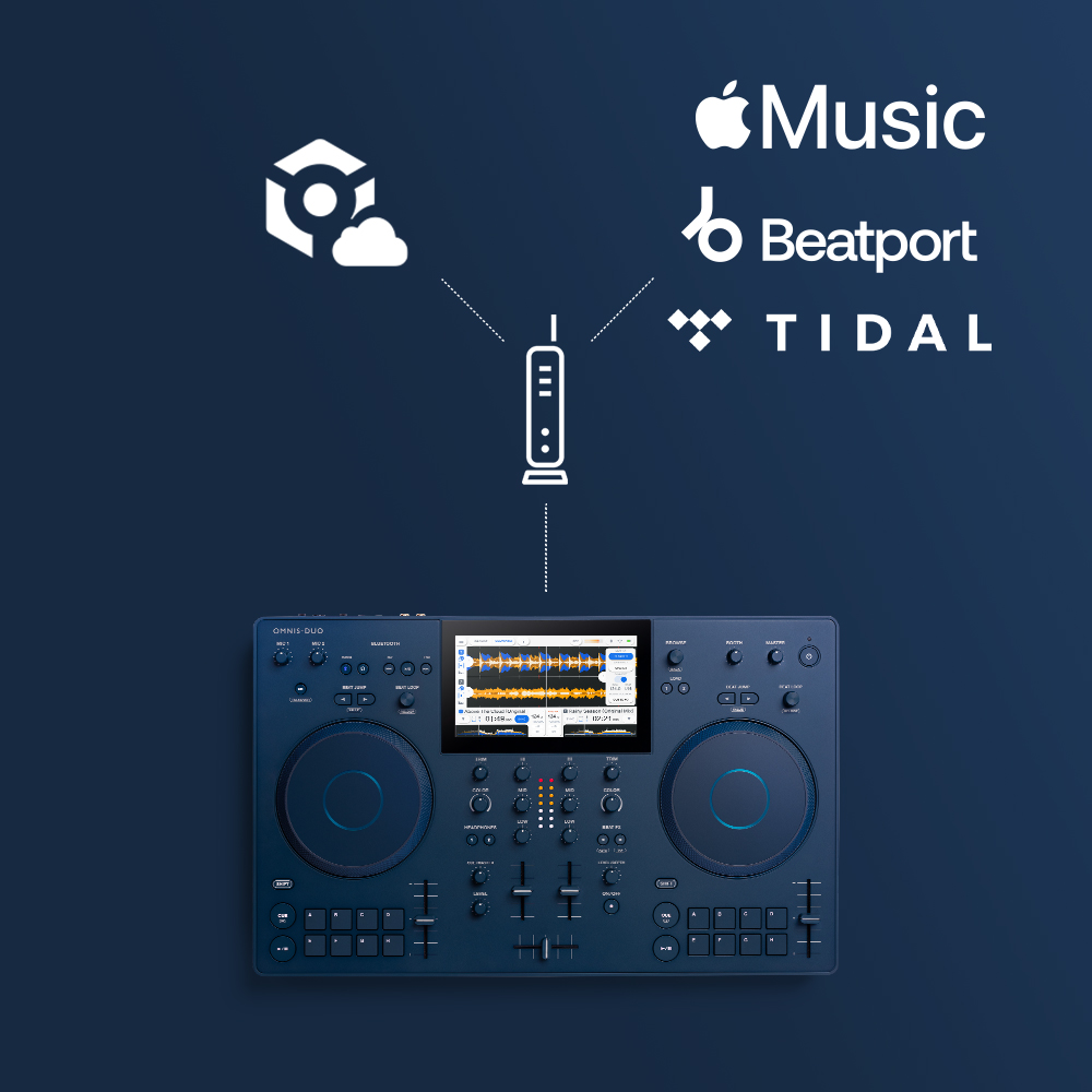 O OMNIS-DUO é compatível com o StreamingDirectPlay, dando-lhe acesso às mais recentes faixas e listas de reprodução selecionadas de plataformas como Apple Music, Beatport Streaming e TIDAL. Com acesso direto a um extenso catálogo de música, não precisa de usar uma unidade USB – basta navegar e reproduzir faixas espontaneamente. Pode até acompanhar a progressão de uma música com facilidade através do ecrã da forma de onda – que inclui informações da análise de BPM e da grelha – e utilizar funcionalidades como o Quantize e o Beat Sync para uma correspondência e mistura rigorosas das batidas.